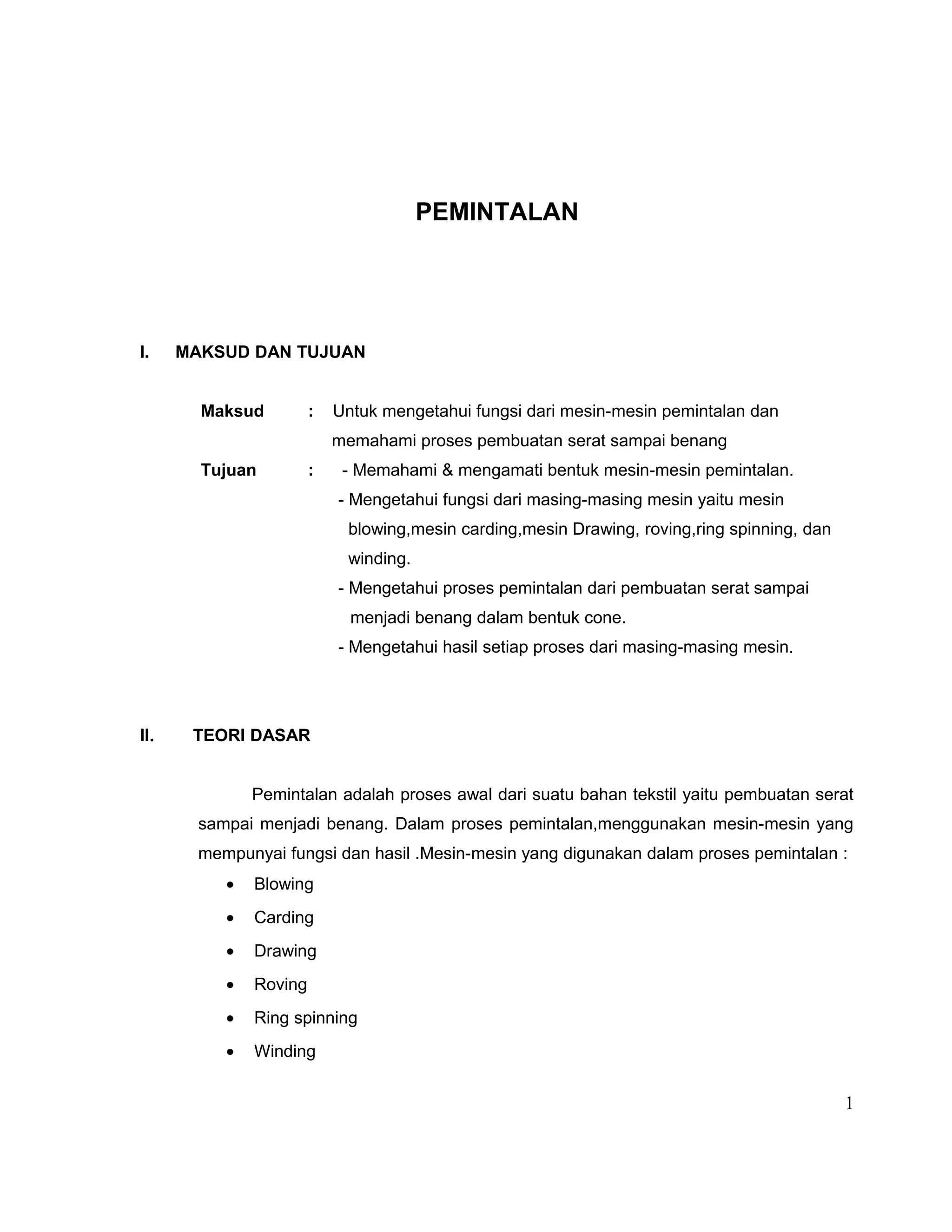 Dokumen ini menjelaskan proses pemintalan benang dari serat, termasuk fungsi berbagai mesin seperti blowing, carding, drawing, dan roving. Setiap mesin memiliki peranan penting dalam mengolah serat menjadi benang dengan memastikan serat terpisah, bersih, dan sejajar. Pemahaman tentang mesin dan proses ini penting untuk menghasilkan benang berkualitas tinggi.