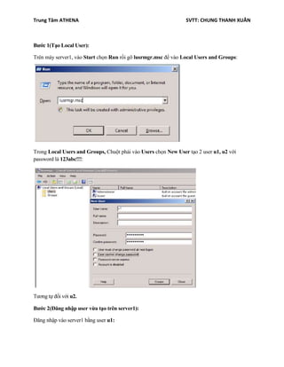 Tài liệu hướng dẫn cách tạo local user và group trên máy Windows Server 2008 cho phép người dùng đăng nhập tự động vào server. Quá trình bao gồm việc tạo người dùng, nhóm, và cấu hình tự động đăng nhập. Các thủ tục cụ thể được thực hiện thông qua các công cụ quản lý người dùng và nhóm trong Windows.