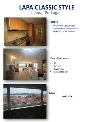 This property listing is for a 147 square meter apartment located in Lapa, Lisbon, Portugal. It is a T2 style apartment within 5 minutes of the town centre and next to the Parliament building. The apartment has a river view and garage and is priced at 1,000,000 euros.