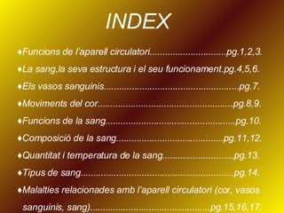 INDEX ♦ Funcionsde l’aparell circulatori..............................pg.1,2,3. ♦ La sang,la seva estructura i el seu funcionament.pg.4,5,6. ♦ Els vasos sanguinis.....................................................pg.7. ♦ Moviments del cor.....................................................pg.8,9. ♦ Funcions de la sang...................................................pg.10. ♦ Composició de la sang..........................................pg.11,12. ♦ Quantitat i temperatura de la sang............................pg.13. ♦ Tipus de sang............................................................pg.14. ♦ Malalties relacionades amb l’aparell circulatori (cor, vasos sanguinis, sang)...............................................pg.15,16,17.
