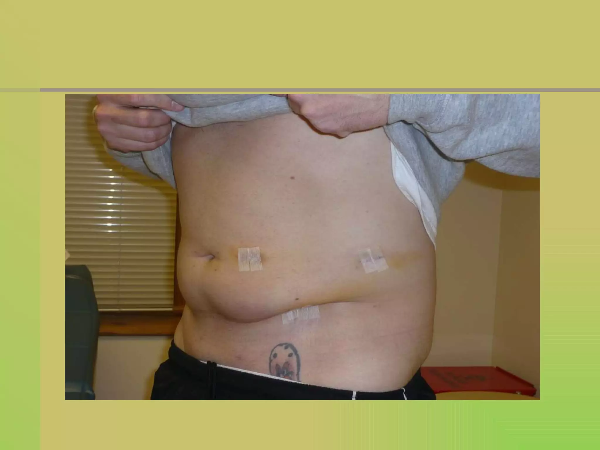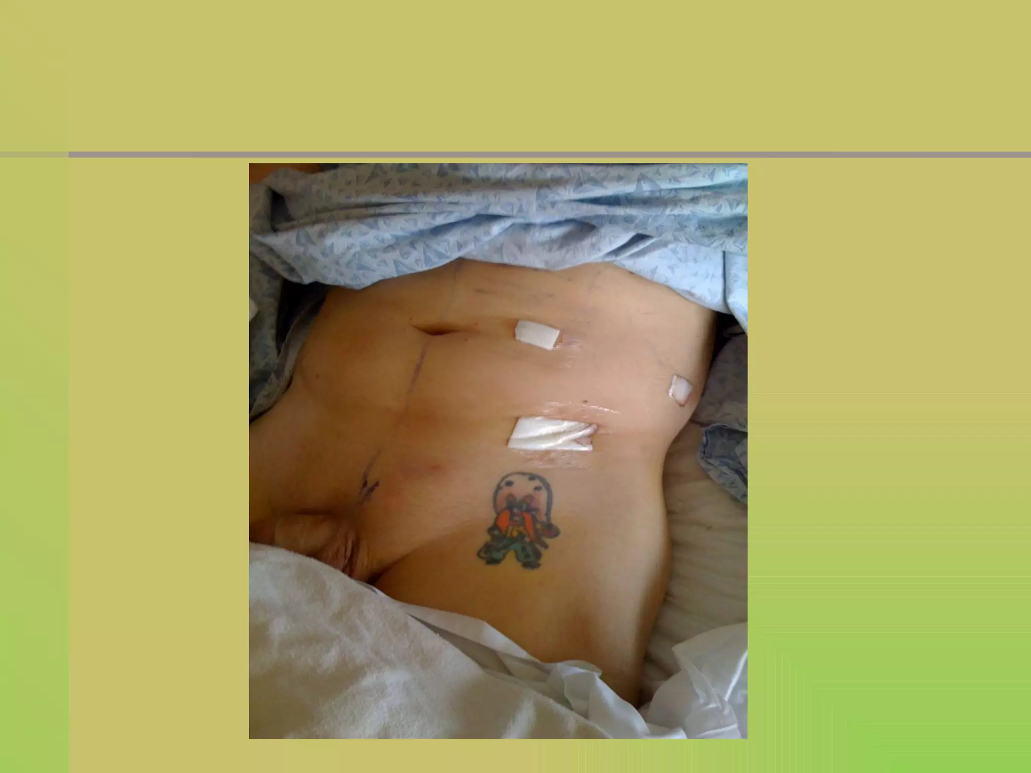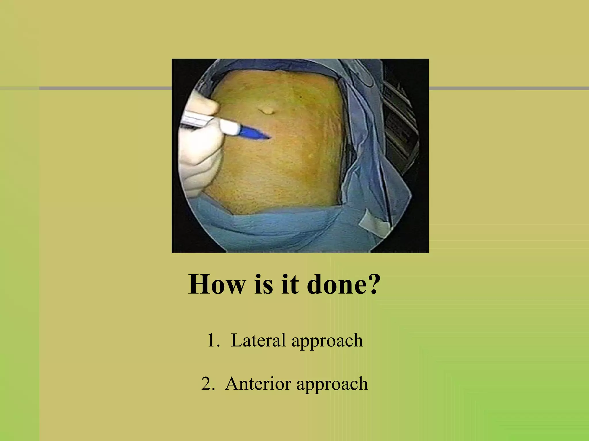 The document discusses different approaches for performing a laparoscopic sigmoid colon resection surgery. It describes the lateral and anterior patient positioning approaches. For the lateral approach, the patient is positioned on their right side and trocars are placed in a triangular configuration. This approach allows for easy mobilization of the splenic flexure but has disadvantages like poor access to the right side of the rectosigmoid area. The anterior approach involves positioning the patient supine and placing trocars in a semicircular configuration above the sigmoid colon. Both approaches aim to bring the proximal colon through the incision sites to allow for a tension-free anastomosis repair. Data on outcomes from 62 patients undergoing either the lateral or anterior approach are also presented.