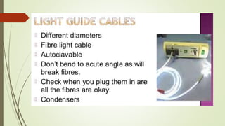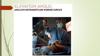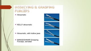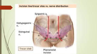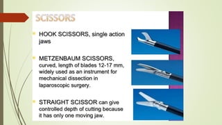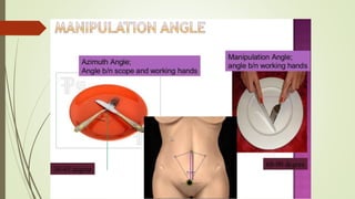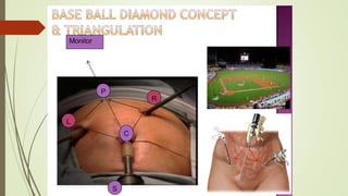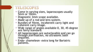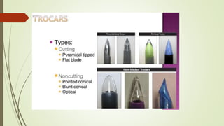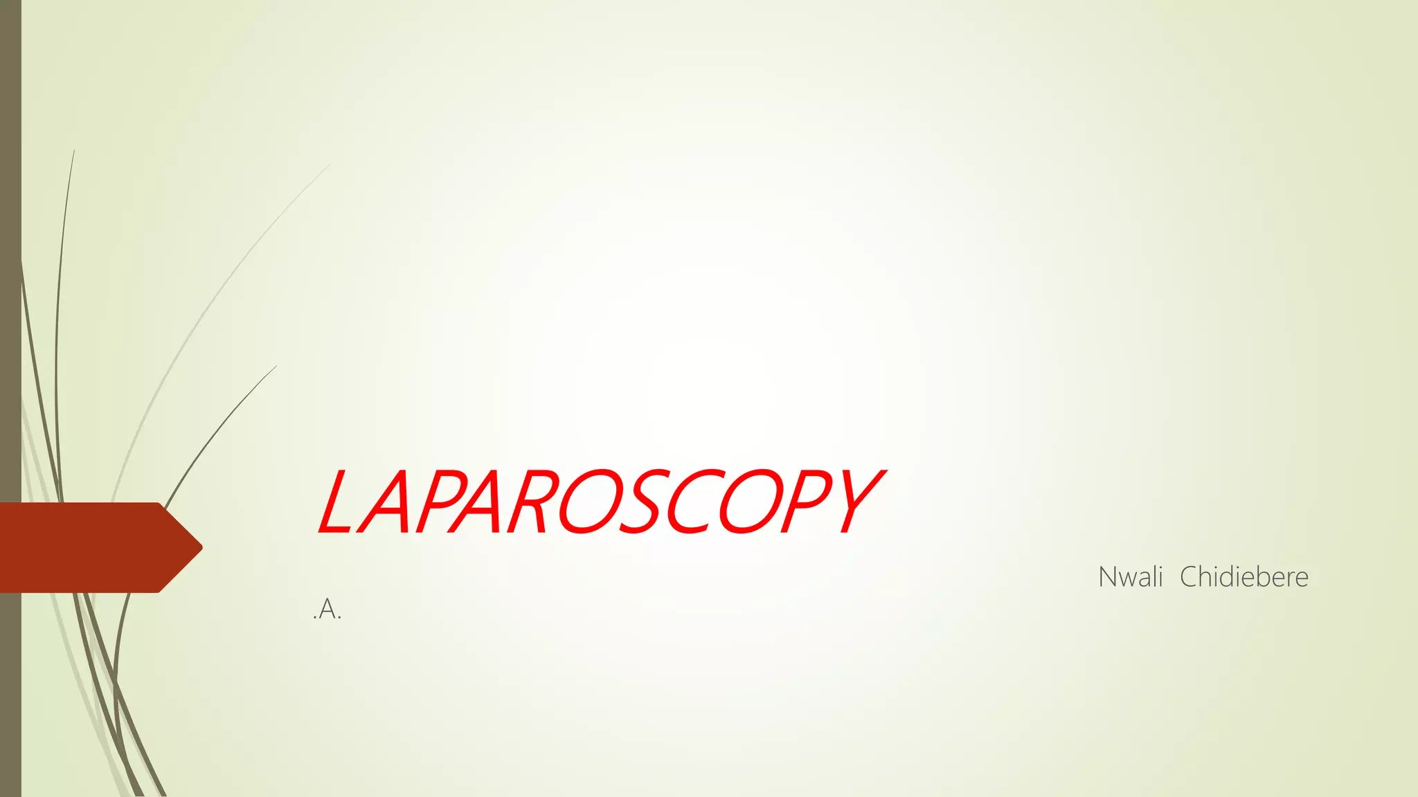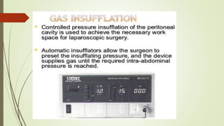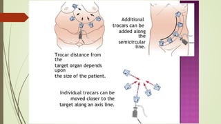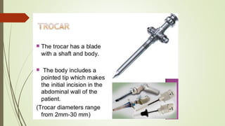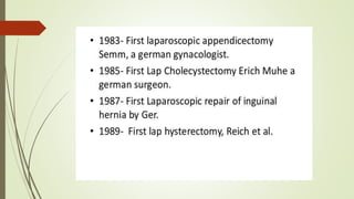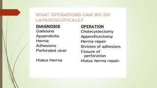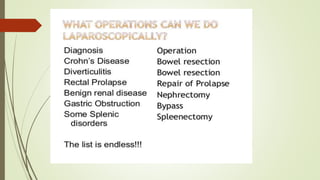 Laparoscopy, also known as keyhole surgery, allows surgeons to examine the abdominal organs through small incisions using a laparoscope. It was developed in the early 1900s and is now commonly used to diagnose and treat conditions of the appendix, gallbladder, intestines, and other abdominal organs. The key advantages of laparoscopy over open surgery are reduced pain, scarring, and recovery time for patients. However, it requires more technical skill from surgeons due to limited movement and vision within the abdominal cavity. Complications can include injuries from trocar insertion or electrical burns, but the risks of laparoscopy are generally low when performed by an experienced surgeon.