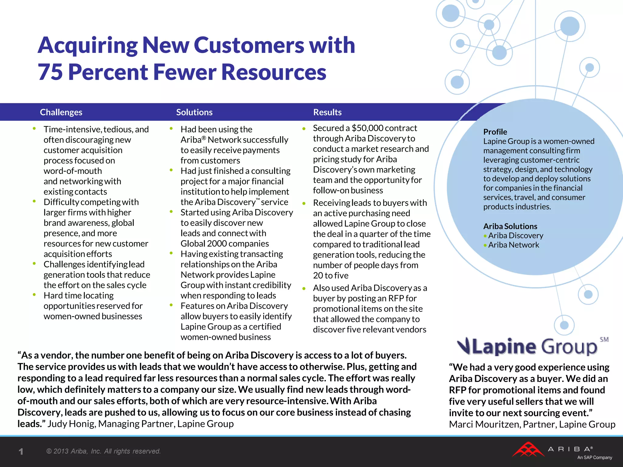 Lapine Group is a women-owned consulting firm that leveraged Ariba Discovery and Ariba Network solutions to more efficiently acquire new customers. They secured a $50,000 contract through leads generated on Ariba Discovery. Posting and responding to opportunities on Ariba Discovery required significantly fewer resources than traditional lead generation, reducing time spent from 20 days to 5 days. Lapine Group was also able to use Ariba Discovery as a buyer to find relevant vendors for an RFP.