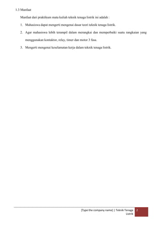 Dokumen ini membahas pentingnya teknik tenaga listrik dalam kehidupan sehari-hari, terutama dalam aplikasi penerangan dan perbaikan masalah listrik. Tujuan praktikum ini adalah memberikan pemahaman teori, keterampilan praktis, dan pengetahuan keselamatan kerja kepada mahasiswa. Selain itu, dokumen ini menjelaskan berbagai komponen seperti push button, relay, lampu pijar, dan kabel serta cara kerjanya dalam sistem listrik.