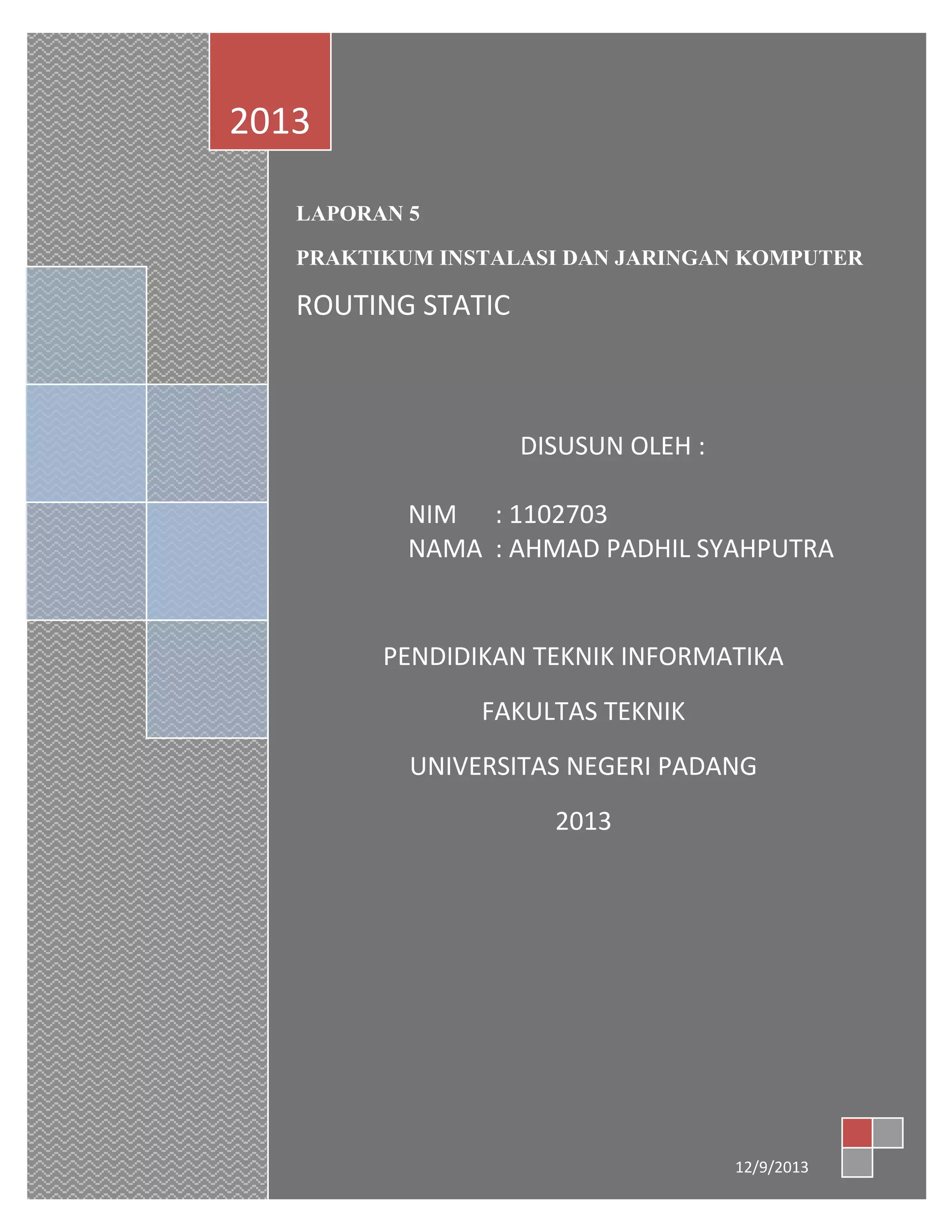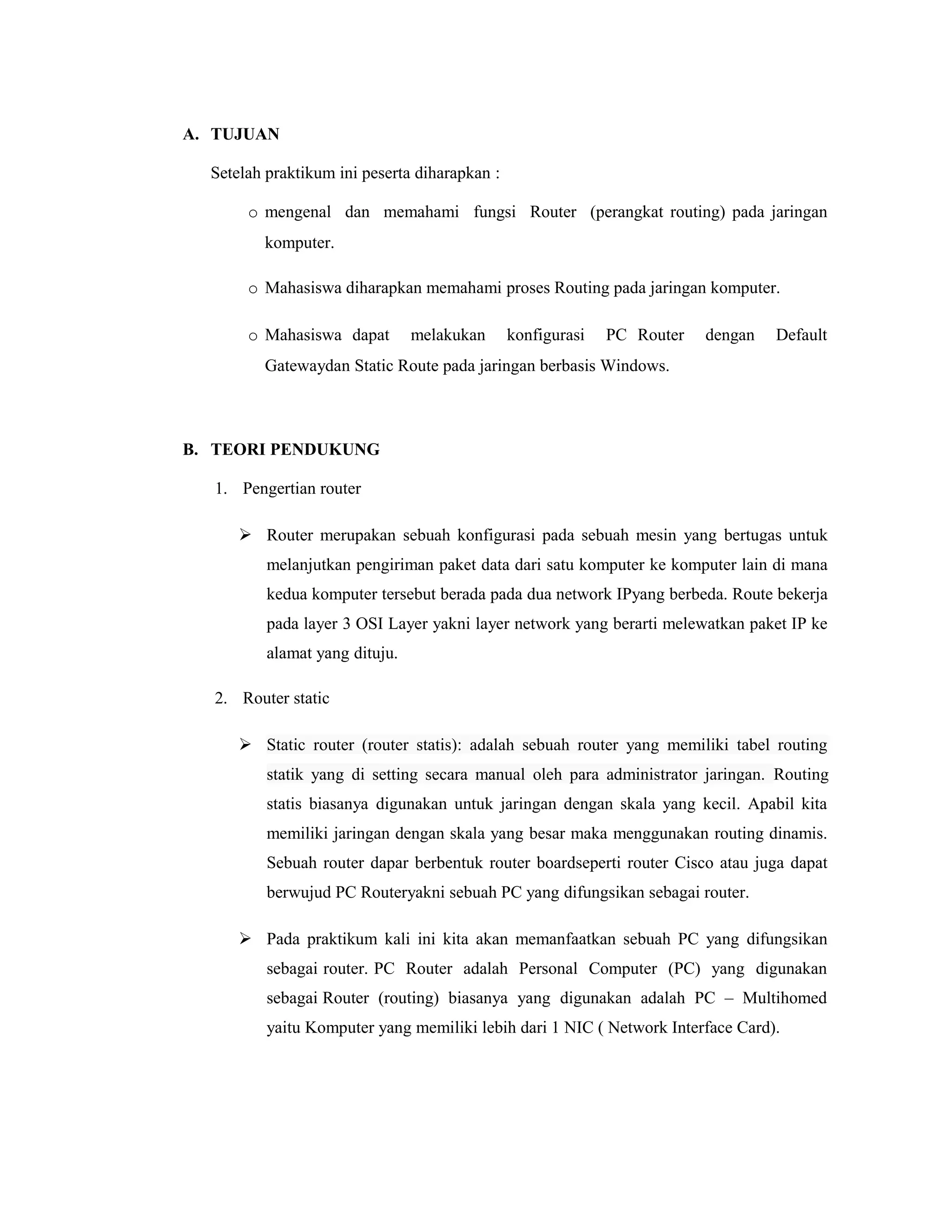 Dokumen ini menjelaskan praktikum routing statis pada jaringan komputer, termasuk pengertian router dan cara konfigurasi PC router dengan default gateway. Mahasiswa diharapkan memahami proses routing dan dapat melakukan konfigurasi yang sesuai dengan kebutuhan jaringan. Terdapat juga langkah-langkah praktikum dan hasil evaluasi uji koneksi yang menunjukkan keberhasilan atau kegagalan pengiriman data antar komputer.