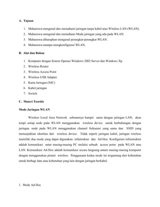 Laporan ini membahas tentang praktikum instalasi dan konfigurasi jaringan nirkabel (wireless LAN). Ringkasan utamanya adalah mahasiswa belajar tentang mode jaringan nirkabel, komponen-komponennya, dan langkah-langkah konfigurasi jaringan nirkabel menggunakan mode infrastruktur seperti mengatur access point dan mengkoneksikan beberapa komputer. Mahasiswa berhasil mengonfigurasi wireless LAN dengan mengatur SSID, channel, security dan tes koneksi