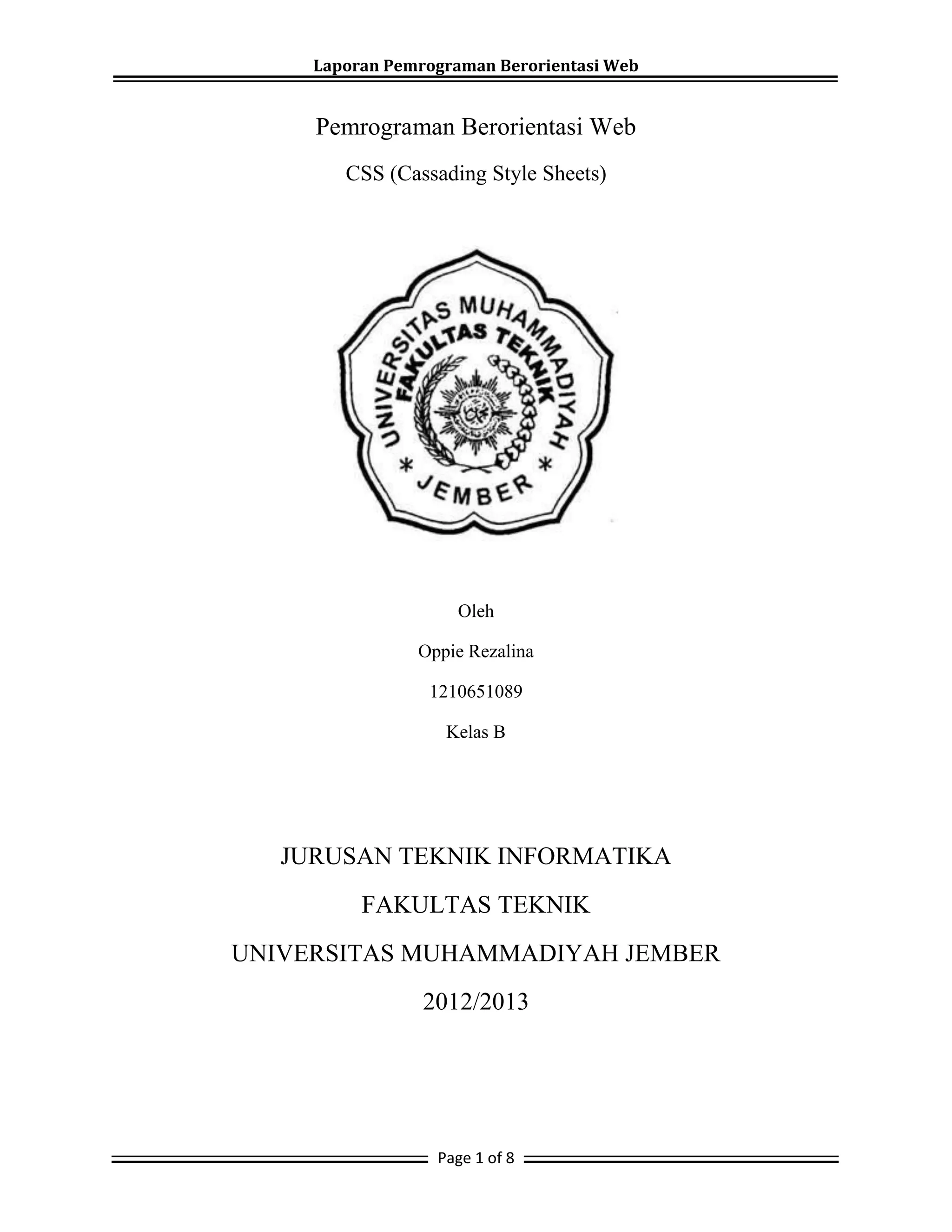 Dokumen ini membahas tentang pemrograman berorientasi web dengan fokus pada CSS (Cascading Style Sheets), menjelaskan dasar-dasar CSS, sintaksis, serta cara penggunaannya dalam HTML. Ditekankan juga keuntungan penggunaan CSS seperti kemudahan penggantian format dan efisiensi dalam pengaturan tampilan halaman web. Terdapat juga tugas praktis untuk menerapkan pengetahuan tentang CSS dalam proyek pemrograman.