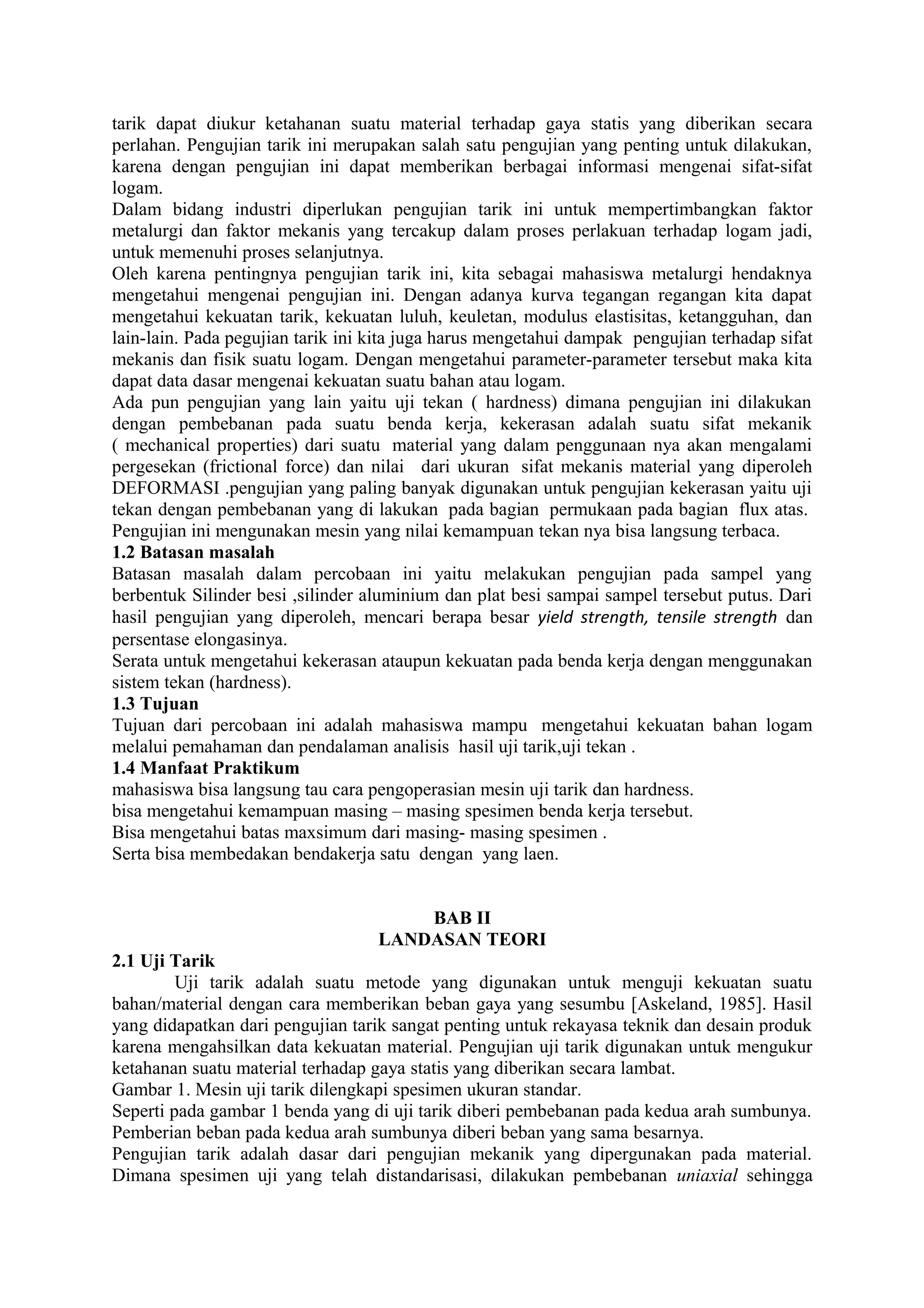 Laporan ini membahas pengujian sifat mekanik logam, khususnya uji tarik dan uji kekerasan. Dilakukan pengukuran kekuatan tarik, batas luluh, dan persentase elongasi pada sampel silinder besi, aluminium, dan plat besi. Hasilnya digunakan untuk mengetahui sifat mekanis masing-masing bahan."