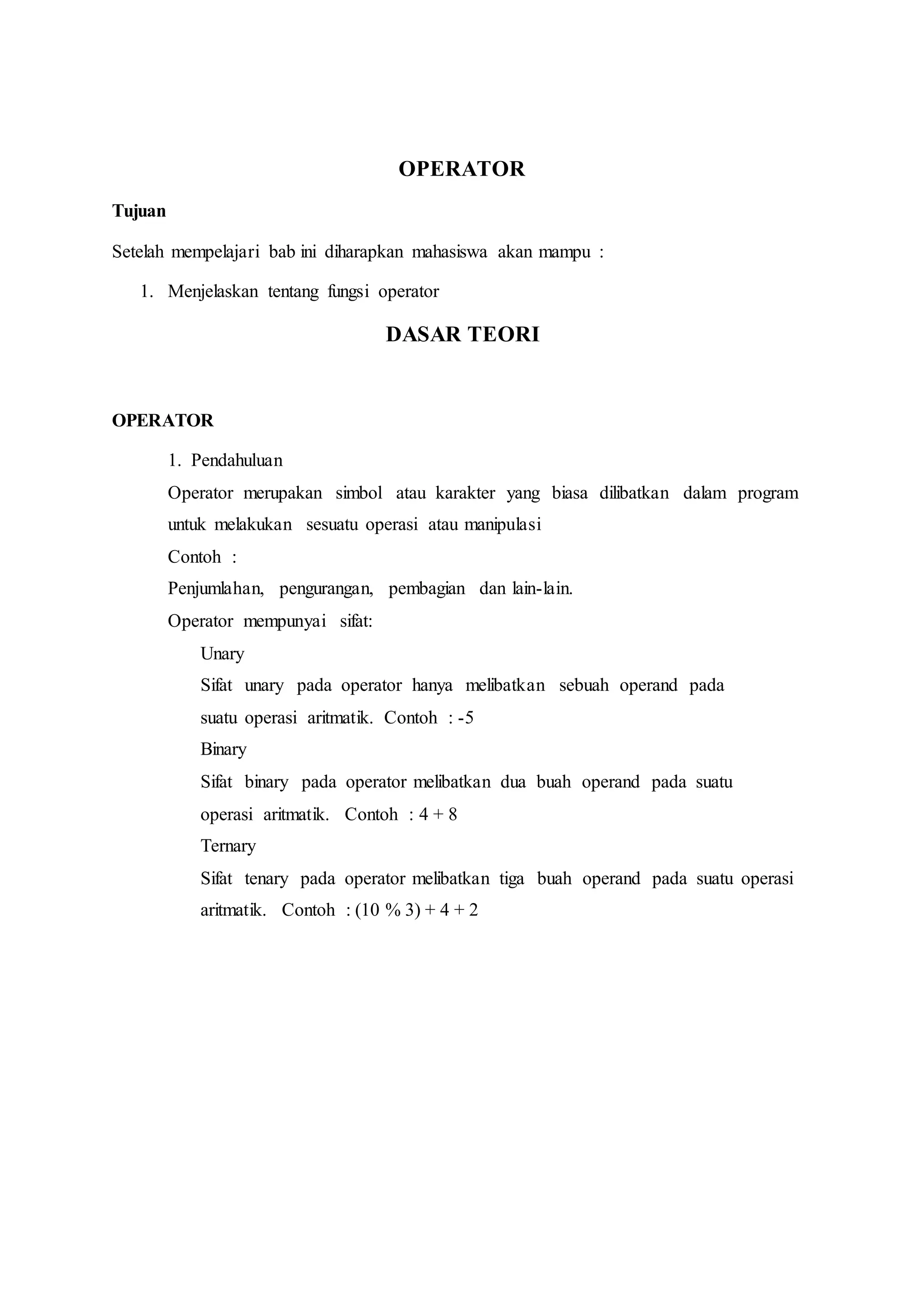 Dokumen ini adalah laporan praktikum mengenai operator dalam pemrograman C++, membahas berbagai jenis operator seperti aritmatika, increment, decrement, relasi, dan logika. Setiap bagian memberikan penjelasan tentang fungsi, contoh penggunaan, serta kesalahan umum dalam koding. Kesimpulan menekankan pentingnya ketepatan sintaks dan penggunaan operator dalam menjalankan program dengan benar.