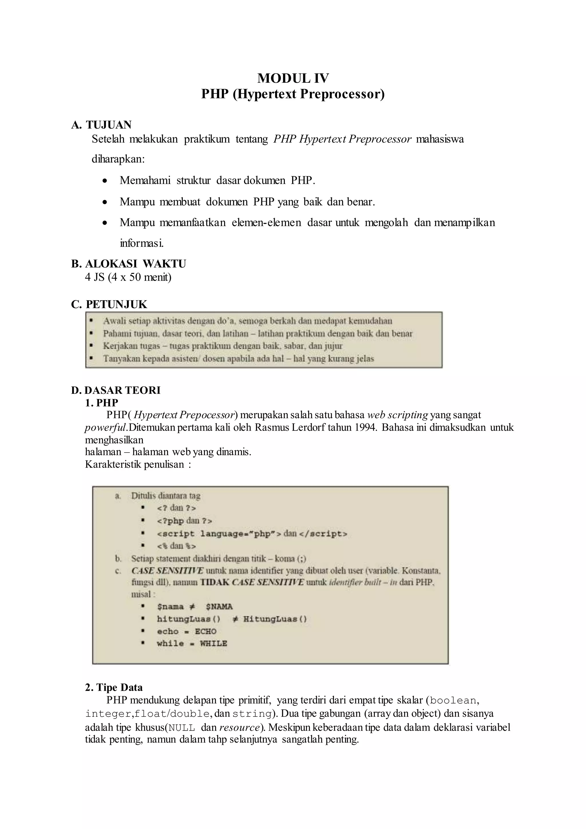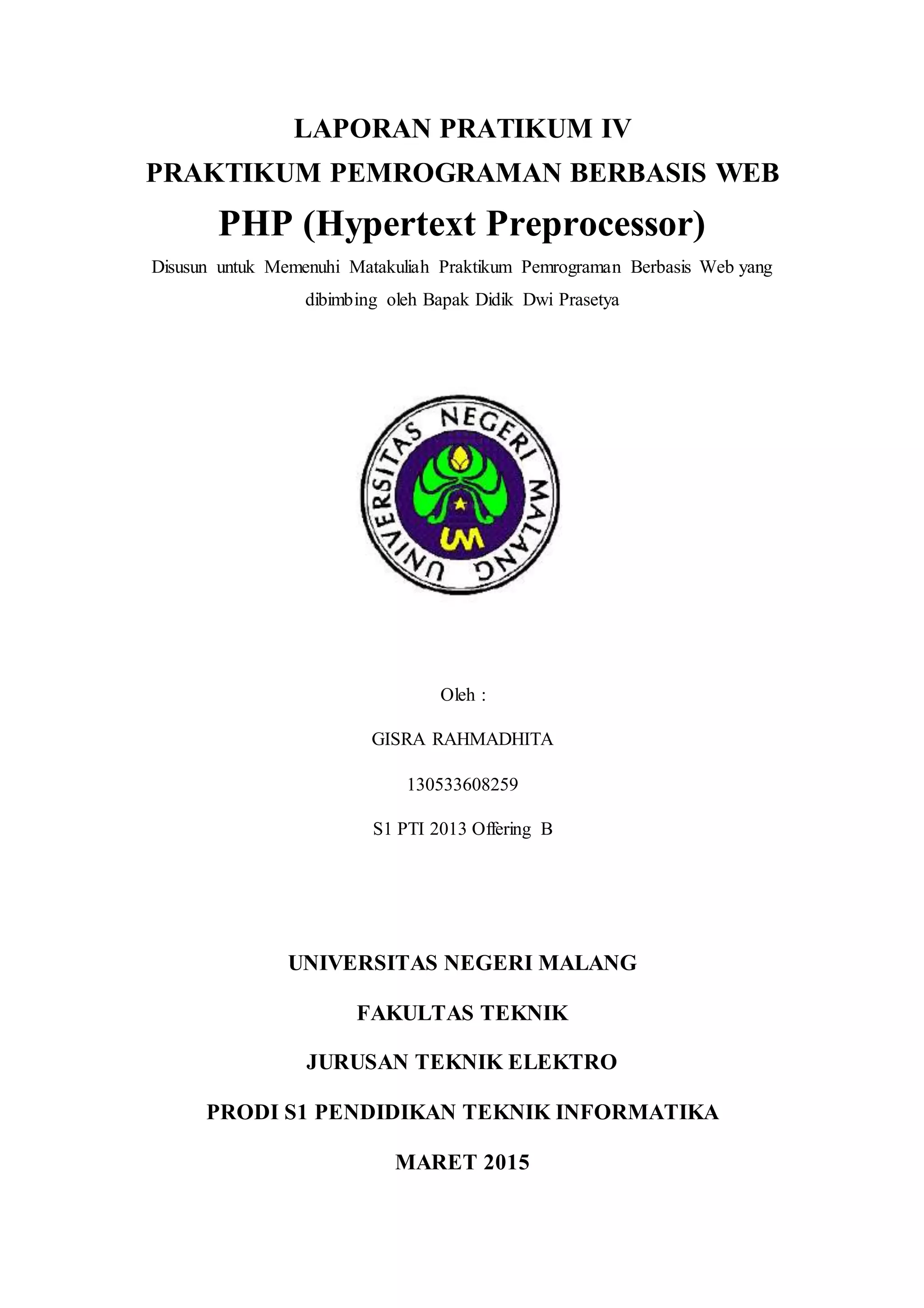 Laporan praktikum ini membahas tentang praktikum PHP (Hypertext Preprocessor) yang bertujuan untuk memahami struktur dasar dokumen PHP, membuat dokumen PHP yang baik, dan memanfaatkan elemen dasar PHP untuk mengolah dan menampilkan informasi. Laporan ini menjelaskan teori dasar PHP, latihan-latihan tentang variabel, pengujian tipe data, pernyataan seleksi, dan contoh kode programnya.
