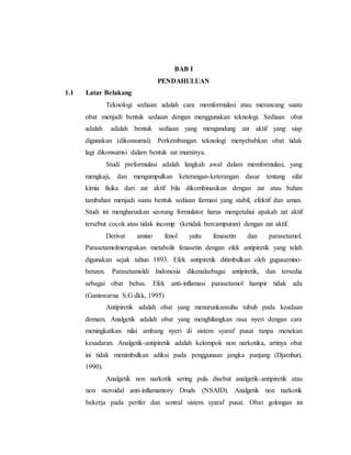 Dokumen tersebut membahas tentang pembuatan sirup parasetamol. Secara singkat, dokumen tersebut menjelaskan tentang latar belakang parasetamol dan sirup, dasar teori pembuatan sirup, preformulasi parasetamol, analisis permasalahan dalam pembuatan sirup parasetamol, dan pendekatan formula pembuatan sirup parasetamol.