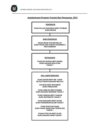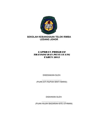 Laporan ini memberikan ringkasan program transisi dan penyayang yang dilaksanakan di Sekolah Kebangsaan Telok Rimba, Ledang Johor selama tiga minggu pada tahun 2012. Program ini bertujuan untuk memudahkan proses penyesuaian murid-murid tahun 1 dengan persekitaran sekolah baru melalui aktiviti seperti mengenal guru dan rakan sekelas, tatacara berurusan di kantin dan tandas, serta pengenalan terhadap peraturan dan kemudahan sekol