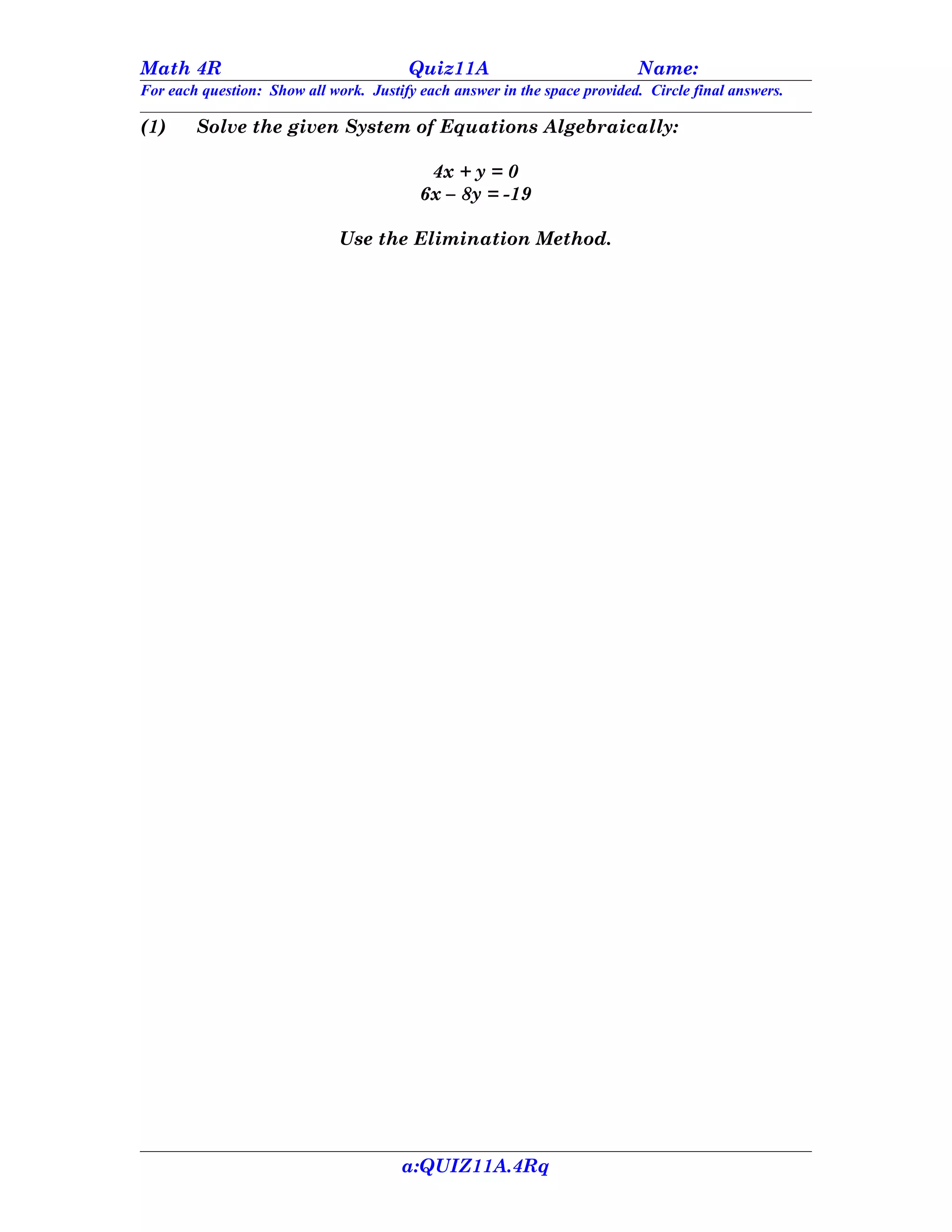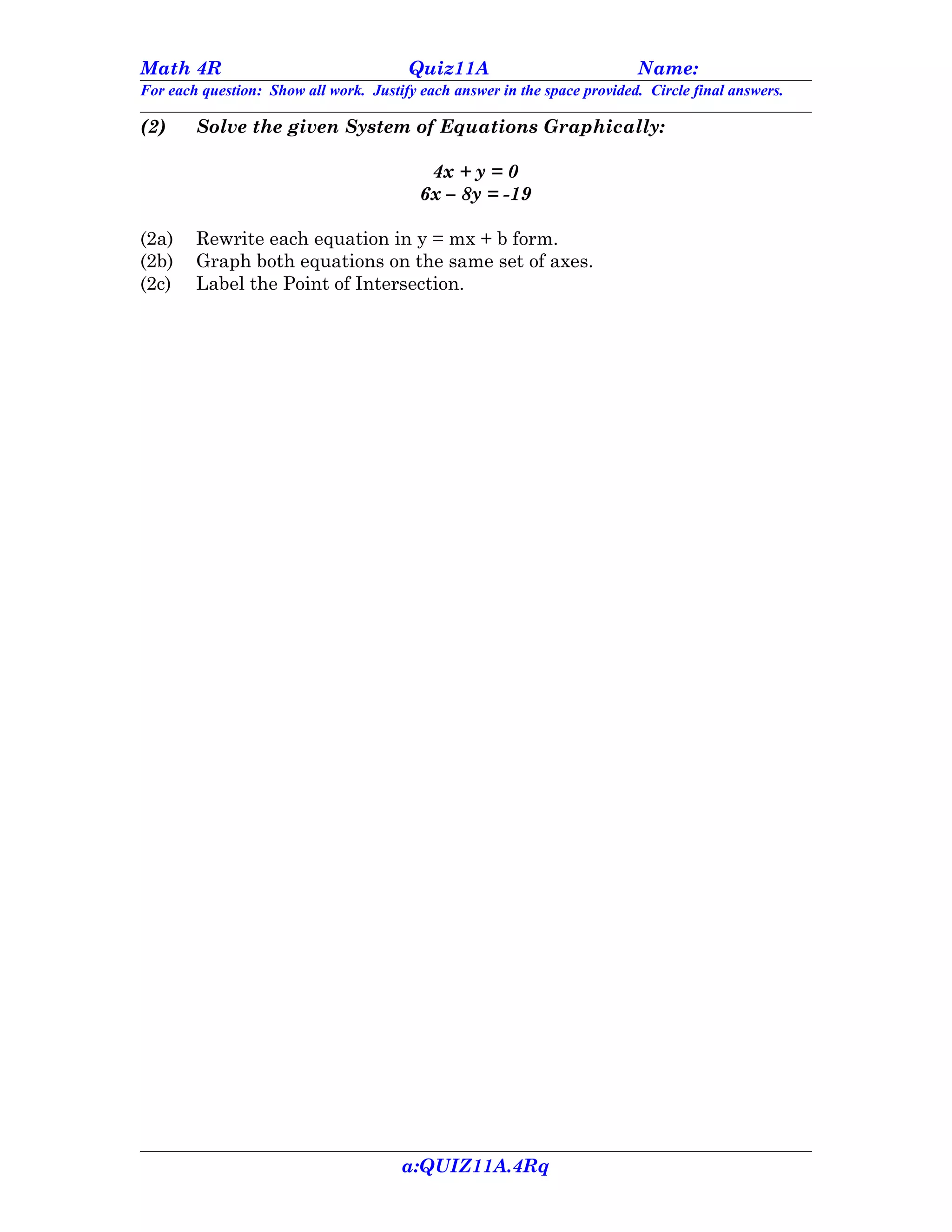 This document contains a math quiz with 5 problems involving systems of equations. The first 3 problems require solving a system of equations using algebraic elimination, graphing, and matrices respectively. The 4th problem involves another system of equations solved using matrices. The bonus 5th problem poses a word problem as a system of equations to be solved using matrices. Students are instructed to show all work and circle final answers.