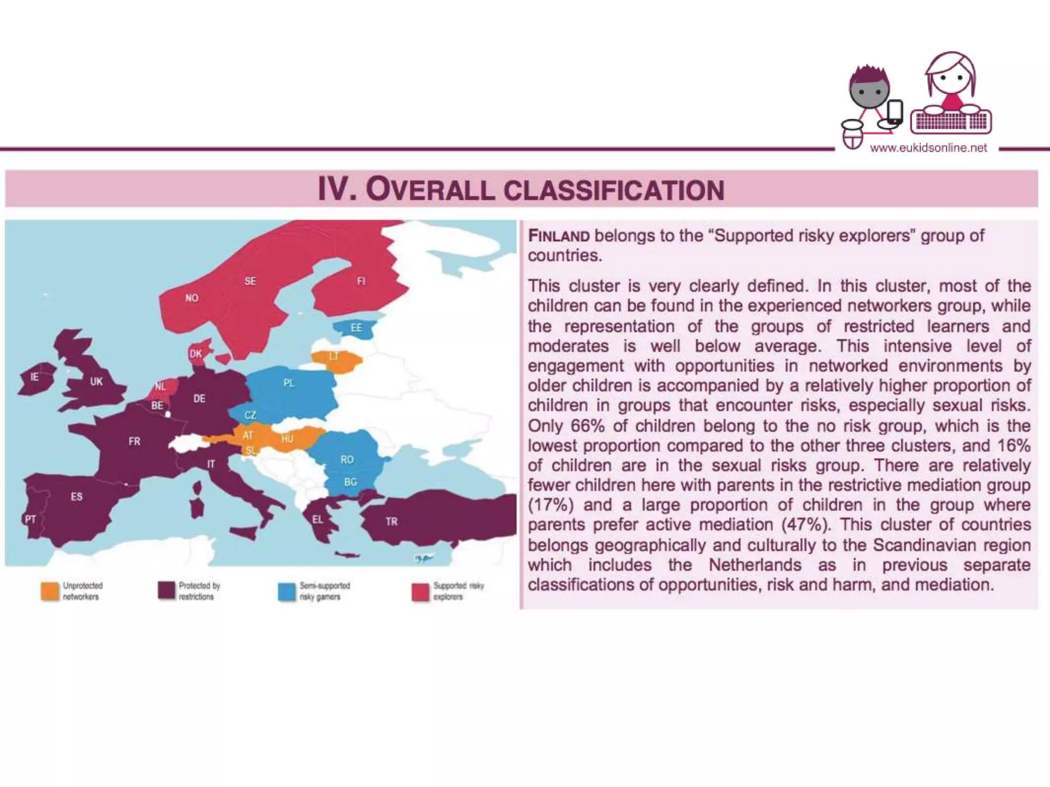 #21 Suomen osalta EU Kids Online –tutkimuksessa on paljon hyviä merkkejä mutta myöskin huolenaiheita. Netin käyttö on runsasta ja se lisää riskejä, erityisesti pornografisen tai alastonkuvia sisältävän aineiston näkeminen on yleistä ja noin 10 prosenttiyksikkö yleisempää kuin Euroopassa yleensä. Lisäksi suomalaisten netin käyttö näyttää olevan yksipuolisempaa kuin muissa maissa. Suomalaiset osaavat kuitenkin digitaalisia taitoja ja eivät koe korkeista riskeistä huolimatta nettiä ongelmana.