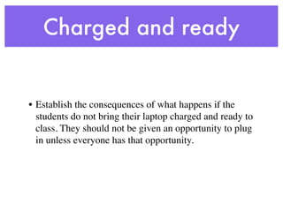 This document provides classroom management tips for teachers with students using laptops in class. It suggests establishing clear expectations that laptops be charged and ready, modeling basic ICT skills, enlisting student ICT helpers, having structured lessons with whole-class and individual/group work segments, moving around the classroom, implementing "lids down" periods, setting rules around gaming and social media, using web tools for student work, ensuring work quality benchmarks, and showcasing high-quality student work. Further reading on 1:1 laptop classroom management is also provided.