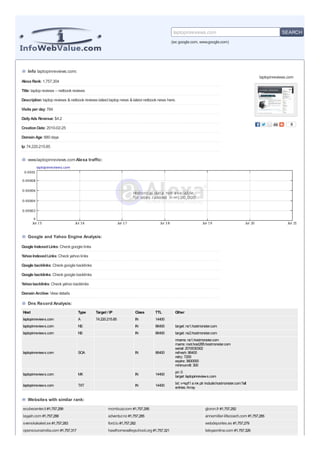 Laptopinreviews.com is a website that reviews laptops and netbooks. According to the analysis, the site receives about 784 visits per day and generates $4.2 in daily ad revenue. It was created in 2010 and is hosted by Hostmonster. The site has over 880 days of domain age and its Alexa global rank is 1,757,304.