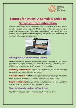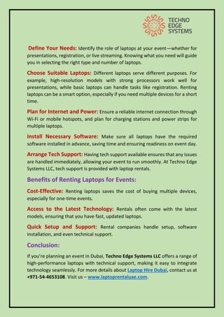 This guide helps you use technology for a smooth experience. If you need Laptop Hire in Dubai, Techno Edge Systems LLC is here to help. We provide quality laptops to ensure your event runs perfectly. Call us at 054-4653108 to make your next event a success! Visit us - https://www.laptoprentaluae.com/laptops-rental-dubai/