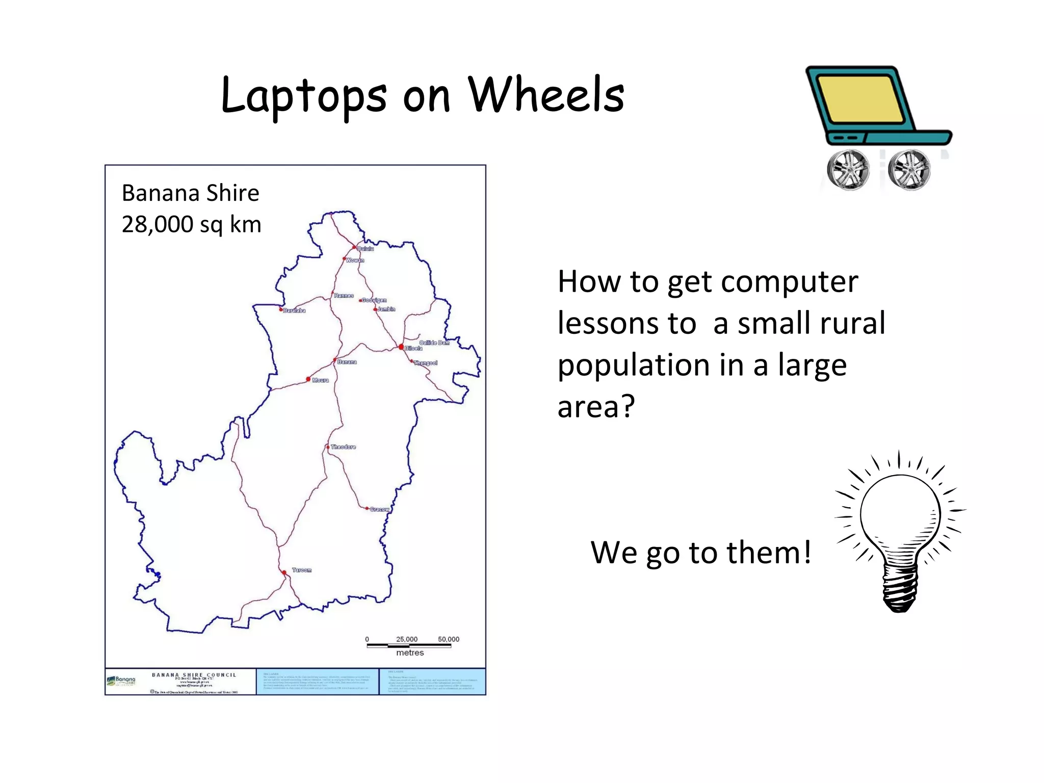 This document discusses a program that brings computer lessons to rural populations across a large area by using "Laptops on Wheels". The program sets up laptop computers and lessons at various community centers and libraries throughout the Banana Shire, which covers 28,000 square kilometers, in order to make computer education accessible to those living in small, remote communities across the large region.