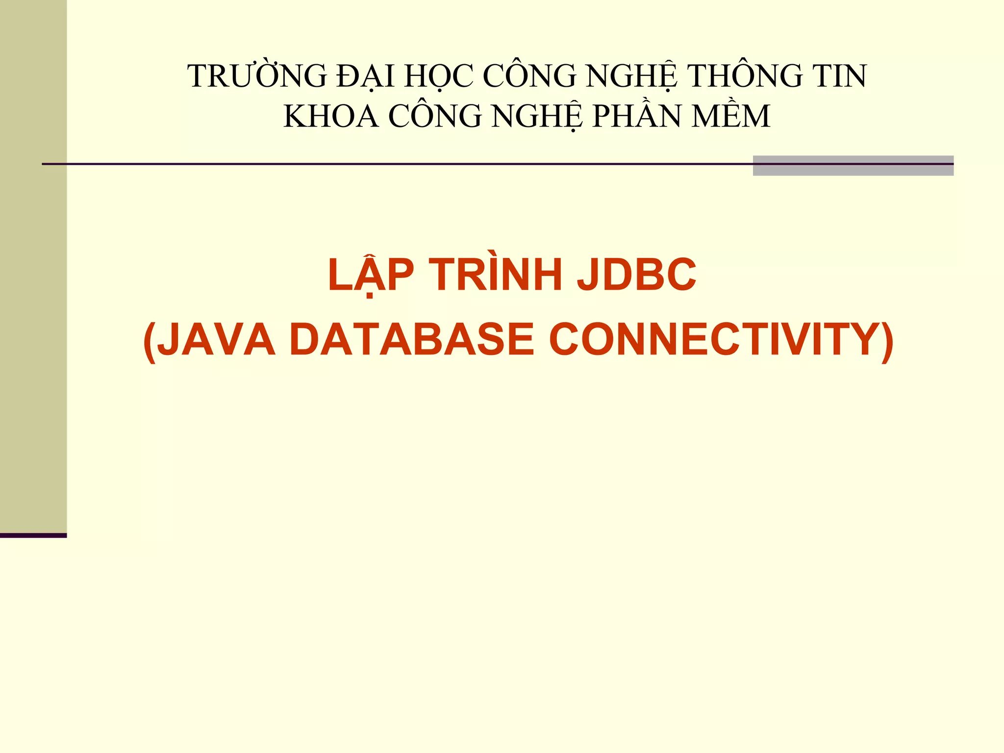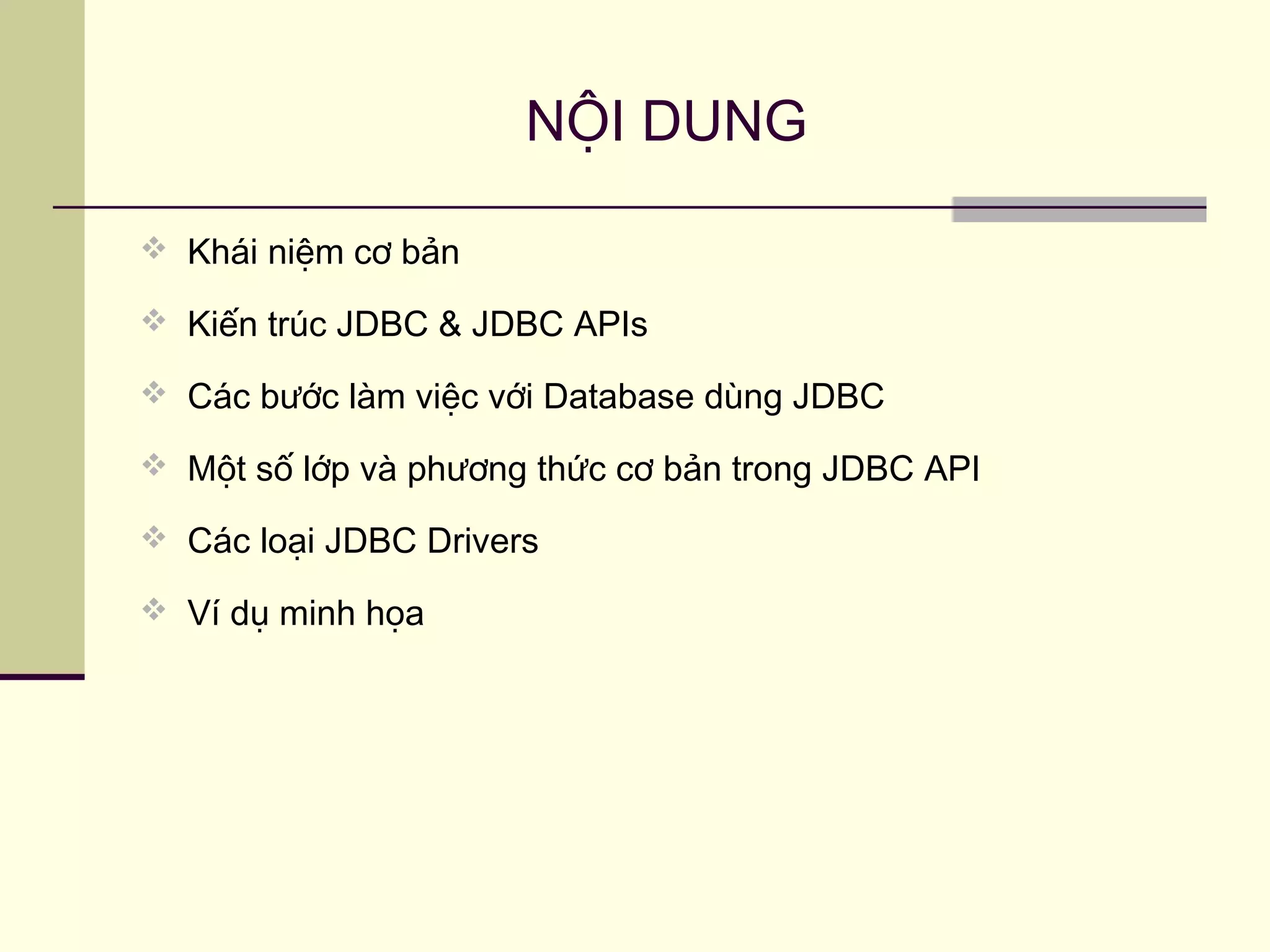Tài liệu mô tả về JDBC (Java Database Connectivity), một thư viện cho phép các ứng dụng Java tương tác với cơ sở dữ liệu qua SQL. Nó gồm các khái niệm cơ bản, kiến trúc JDBC, các loại driver cũng như các bước làm việc với cơ sở dữ liệu sử dụng JDBC. Tài liệu cũng cung cấp ví dụ minh họa về cách thực hiện các thao tác cơ bản với cơ sở dữ liệu trong Java.