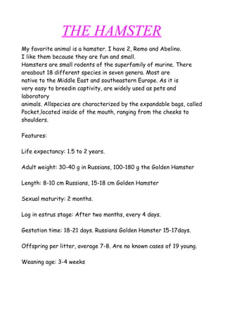 My favorite animal is a hamster. I have 2 pets named Remo and Abelino. Hamsters are small rodents native to parts of the Middle East and Europe that are commonly kept as pets due to their easy breeding in captivity. They have expandable cheek pouches and come in different species ranging in size from 30-40g Russians to 100-180g Golden Hamsters.