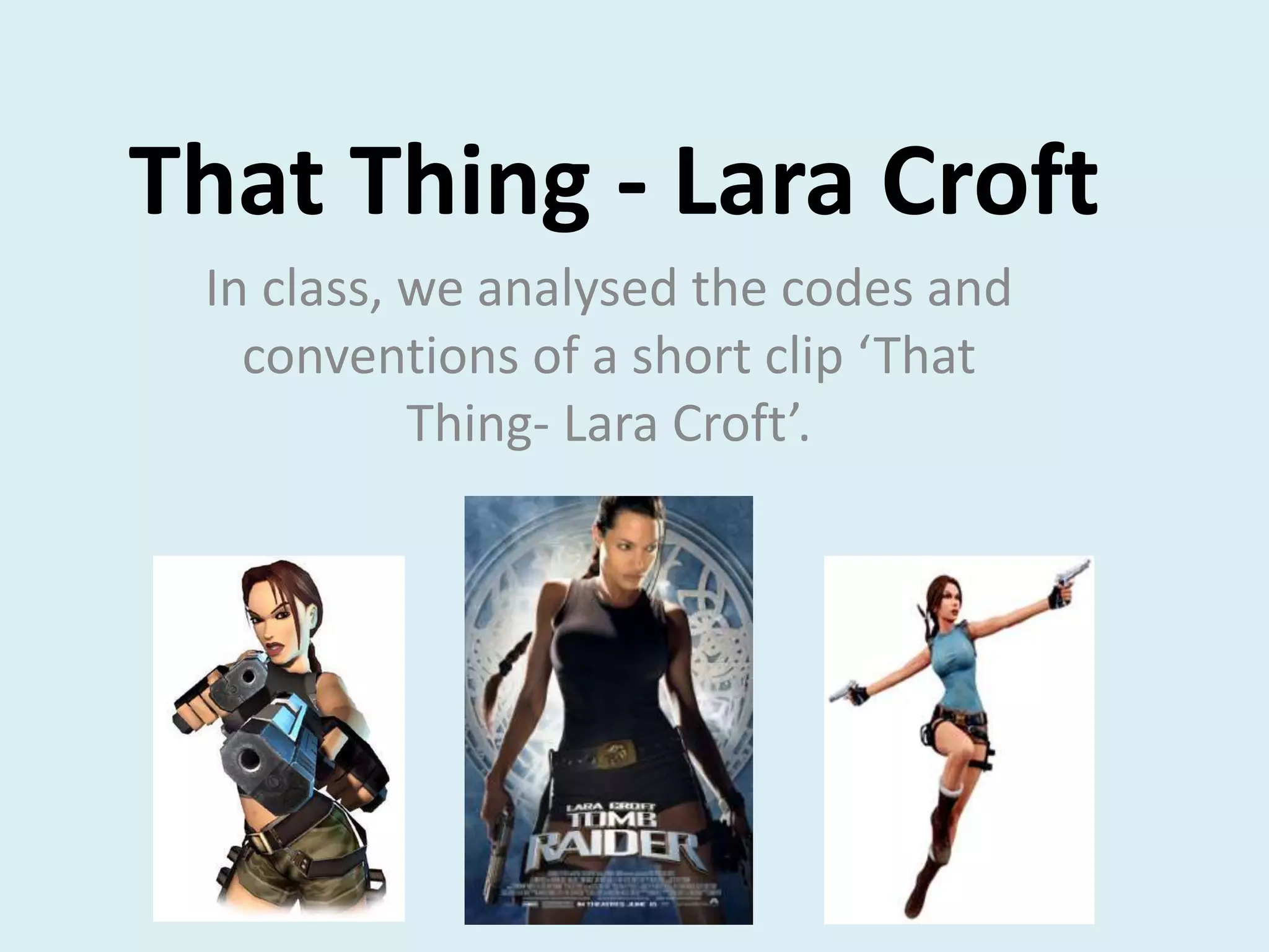 This short documentary analyzes the codes and conventions used in the video "That Thing - Lara Croft" through a non-linear narrative structure. It discusses themes of sexualization, gaming culture, and the representation of women. Through techniques such as close-up shots, chromakey, voiceovers and fast editing, the documentary examines how the video appeals to its target audience. It also incorporates archive material from websites, films, advertisements and interviews.
