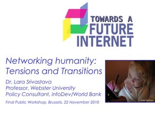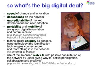 The document discusses the evolving role of technology in society, emphasizing its transition from a mere tool to a pivotal social artifact that influences human identity and relationships. It highlights key trends such as increased dependence on networks, the unpredictability of market developments, and the rise of participatory web culture. Additionally, it outlines guiding principles for a future internet that is accessible, inclusive, and secure.