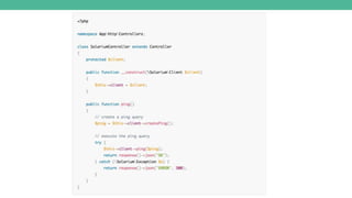 This document discusses integrating Solr with Laravel to create a powerful search solution, highlighting the limitations of MySQL for search tasks and the benefits of switching to Solr, such as improved speed, relevancy, and decreased costs. It includes practical information on setting up both MySQL and Solr, configuring them, and utilizing Solarium for communication with Solr. Additionally, it outlines the essential steps to integrate and test Solr within a Laravel application.