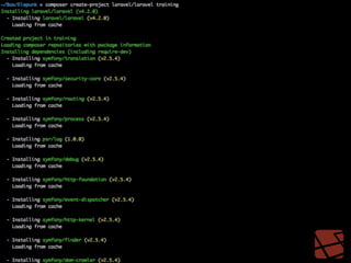 This document provides an overview of the Laravel PHP framework. It describes key Laravel concepts like MVC architecture, Eloquent ORM, Blade templating, routing, controllers, authentication, Artisan CLI, and Inversion of Control using service providers. It also lists requirements to set up a Laravel project and ways to create one using the Laravel installer or Composer.
