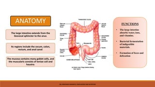 The document discusses the anatomy, functions, digestion and role of bacteria in the large intestine. It also summarizes ulcerative colitis, Crohn's disease and constipation by comparing their symptoms, diagnosis, causes and common treatments. Key biochemical parameters for diagnosing intestinal disorders are outlined. The importance of nutritional management for conditions like Crohn's disease, ulcerative colitis and constipation is highlighted. A case study treatment plan for Crohn's disease focuses on achieving goals like weight gain, normalizing stool and managing gastrointestinal complaints through an enriched diet and supplementation.