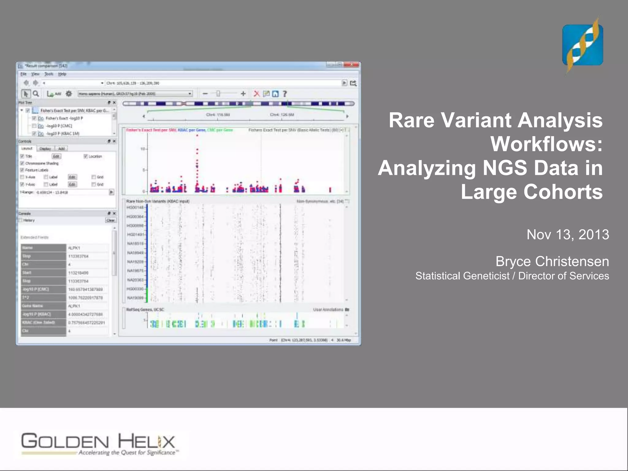 The document discusses rare variant analysis workflows for next-generation sequencing (NGS) data in large cohorts, highlighting tools and techniques for analyzing rare variants. It covers topics such as the importance of combining rare variants for analysis, various methods for approaching rare variant tests, and the functionalities of the software suite by Golden Helix, including GenomeBrowse and SNP & Variation Suite (SVS). The document emphasizes the need for consistency in NGS analysis and offers practical insights into managing and visualizing genetic data.