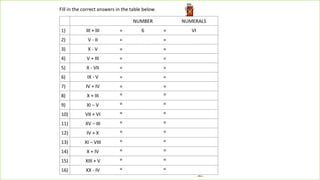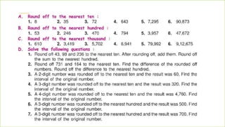 This document provides information about large numbers and place value systems. It covers topics like place value, the Indian and international place value systems, expanded and standard forms for writing numbers, and rounding numbers to the nearest ten, hundred or thousand. It also includes information about the largest and smallest numbers for a given number of digits. Roman numerals and their values are defined at the end.