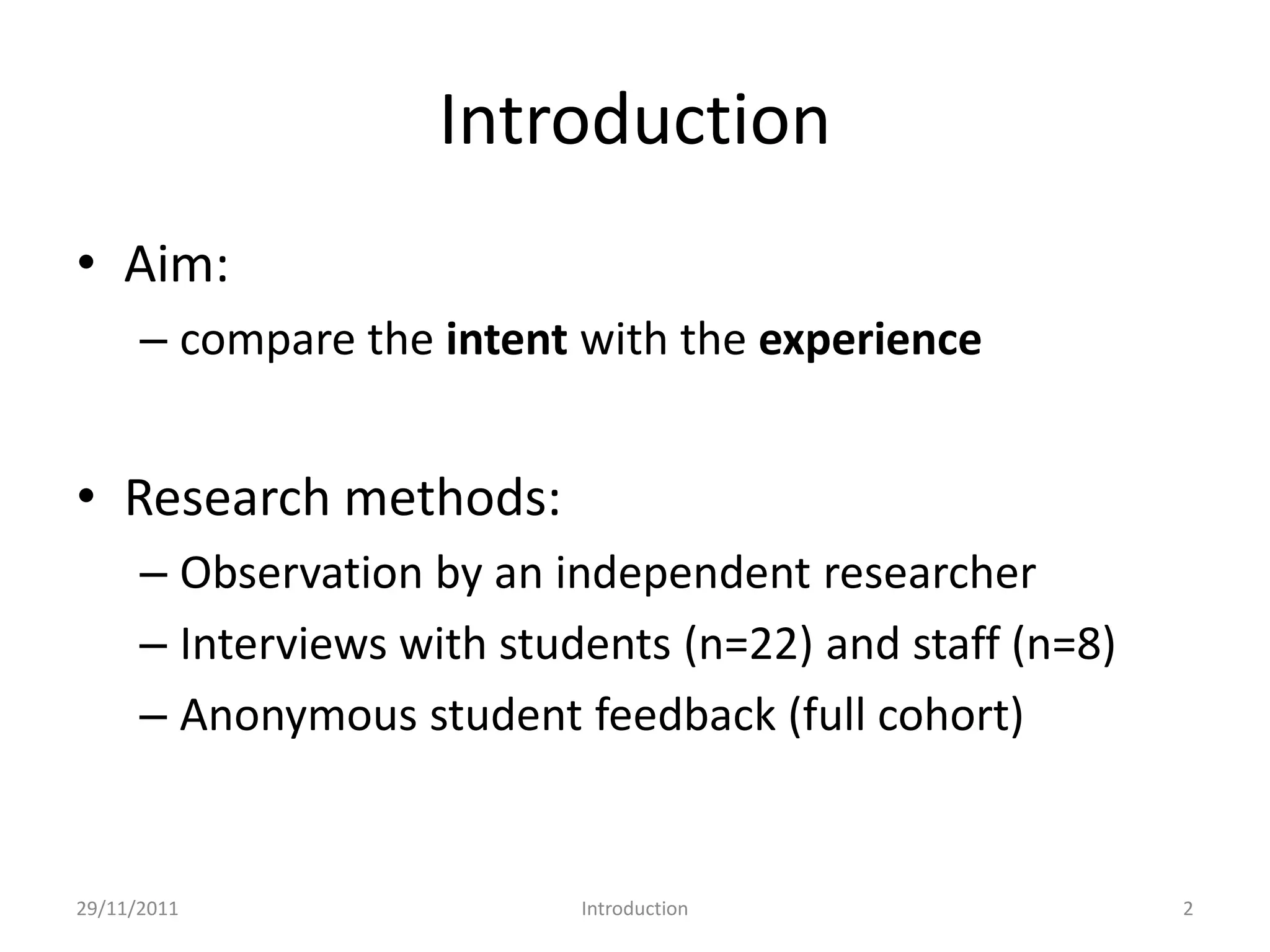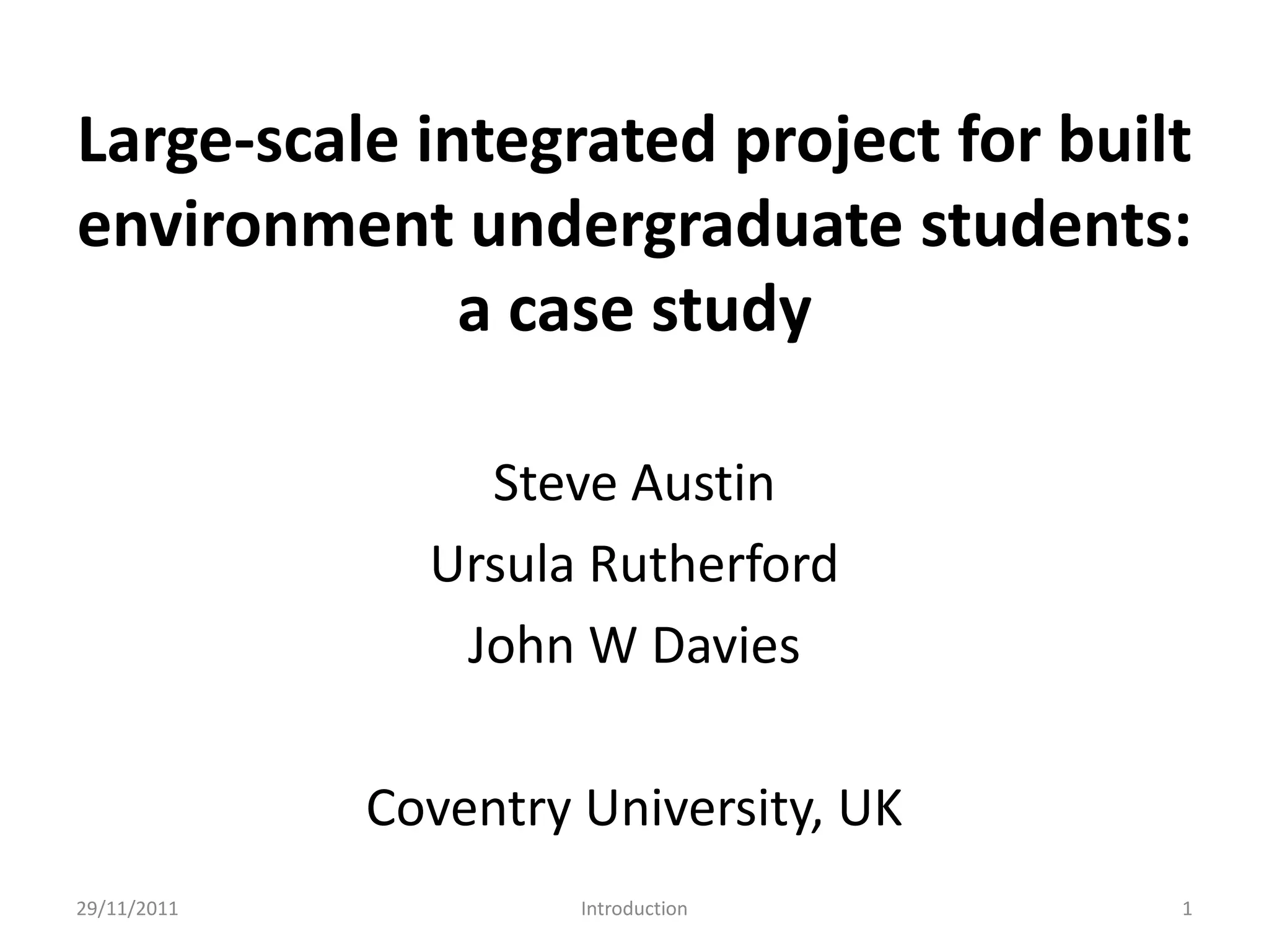 The document presents a case study on a large-scale integrated project designed for built environment undergraduate students, focusing on their learning experiences and outcomes. It details the research methods used, including student and staff interviews, assessment strategies, and challenges faced by both students and faculty. The findings highlight areas for improvement in teaching methodologies, student feedback, and future project implementation.