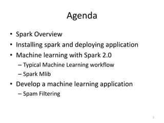 The document provides an example of building a spam filtering application in Spark. It involves reading email data, extracting features using tokenization and hashing, training a logistic regression model, evaluating performance on test data, and tuning hyperparameters via cross validation.
