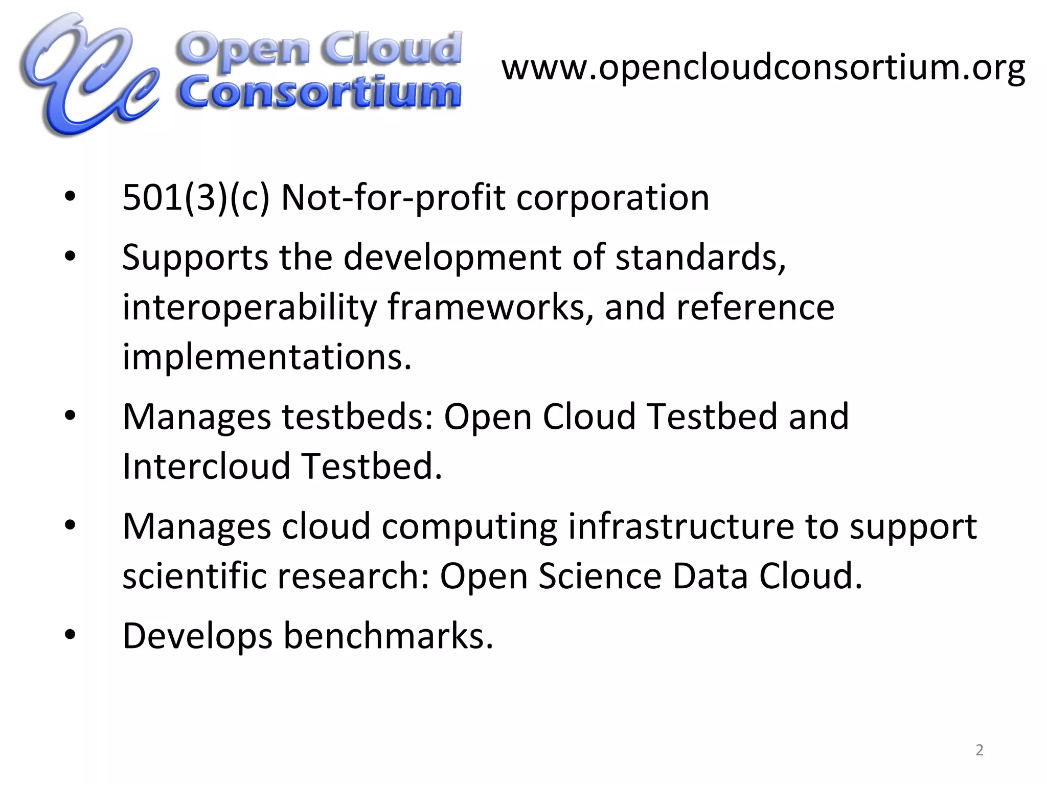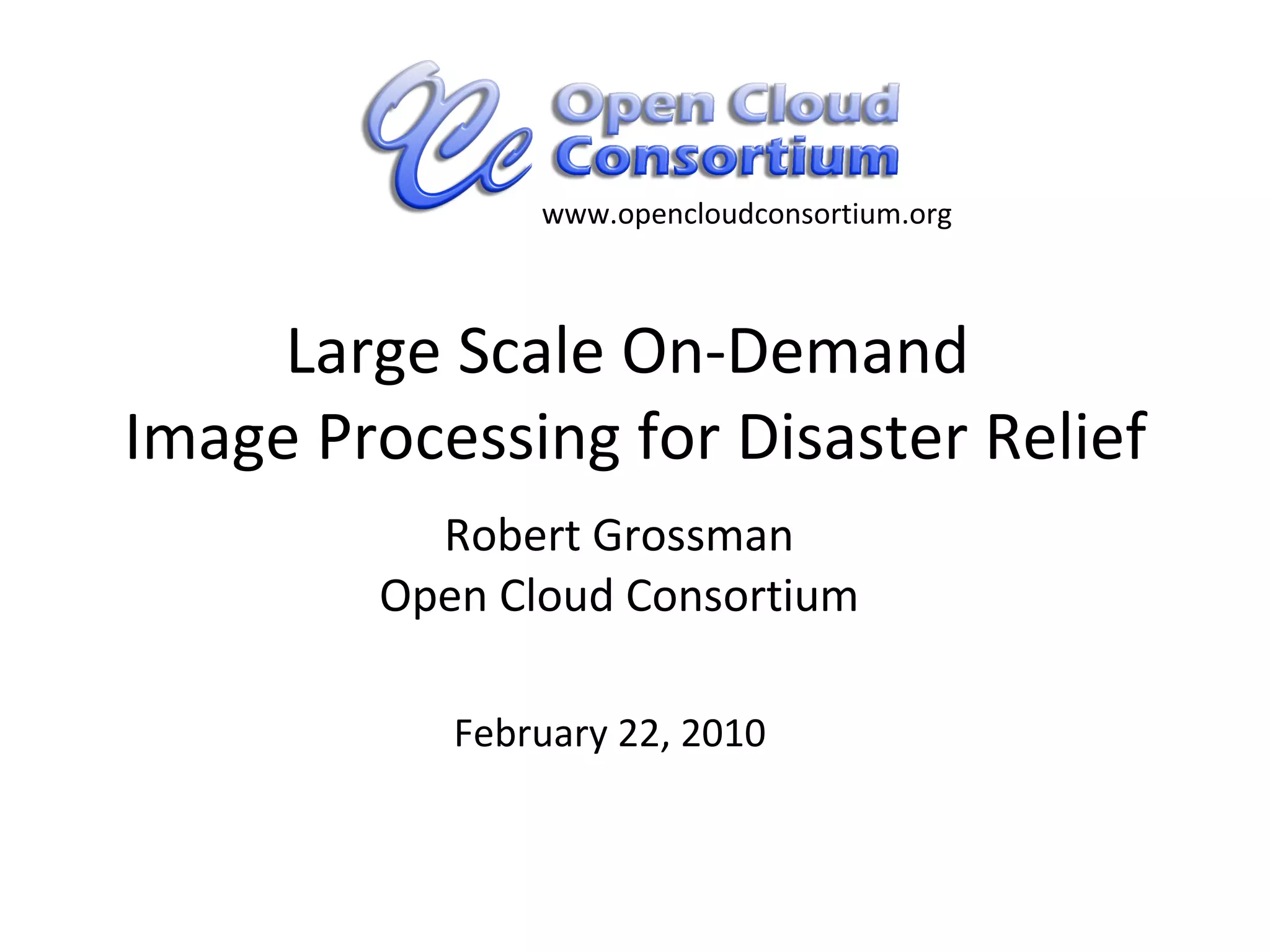 The document discusses the development of large-scale on-demand image processing capabilities for disaster relief by the Open Cloud Consortium, focusing on cloud technology frameworks and data interoperability. It details the functionalities of a testbed supporting high-performance image processing applications, utilizing a structured approach to manage large data sets. Upcoming steps include the establishment of a persistent cloud infrastructure for image processing by May 15, 2010, aimed at aiding disaster relief efforts.