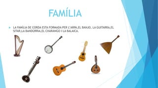 DE CORDA ESTA FORMADA PER L’ARPA,EL BANJO, LA GUITARRA,EL SITAR,LA BANDÚRRIA,EL CHARANGO I LA BALAICA.