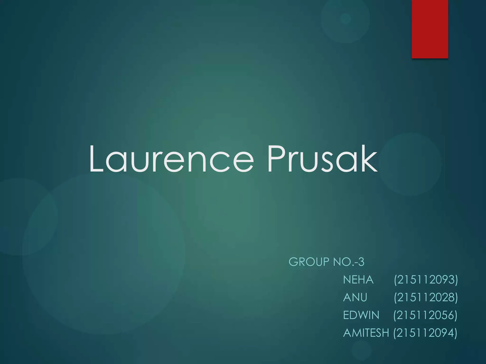Larry Prusak is a prominent figure in knowledge management, emphasizing its critical role as a corporate asset. He has authored and contributed to numerous influential publications while holding various leadership roles in organizations like IBM and Ernst & Young. His work focuses on leveraging knowledge and storytelling for organizational success and the impact of social networks on knowledge management practices.