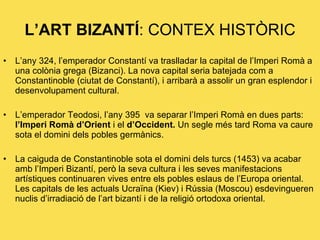 L’ART BIZANTÍ :CONTEX HISTÒRIC L’any 324, l’emperador Constantí va traslladar la capital de l’Imperi Romà a una colònia grega (Bizanci). La nova capital seria batejada com a Constantinoble (ciutat de Constantí), i arribarà a assolir un gran esplendor i desenvolupament cultural. L’emperador Teodosi, l’any 395 va separar l’Imperi Romà en dues parts: l’Imperi Romà d’Orient i el d’Occident. Un segle més tard Roma va caure sota el domini dels pobles germànics. La caiguda de Constantinoble sota el domini dels turcs (1453) va acabar amb l’Imperi Bizantí, però la seva cultura i les seves manifestacions artístiques continuaren vives entre els pobles eslaus de l’Europa oriental. Les capitals de les actuals Ucraïna (Kiev) i Rússia (Moscou) esdevingueren nuclis d’irradiació de l’art bizantí i de la religió ortodoxa oriental.
