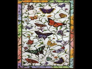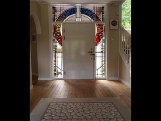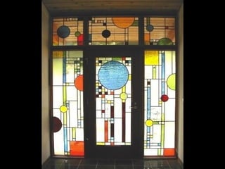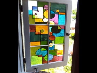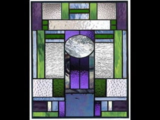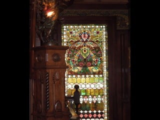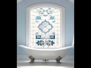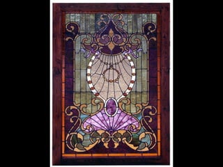 This document contains images and descriptions of various stained glass works from around the world, including a 1908 Tiffany stained glass ceiling from a hotel in Mexico, stained glass windows from churches and cathedrals in Poland, Portugal, and Norway, and examples of stained glass being used in non-traditional settings like bathrooms, hotels, and decorative home accessories. The stained glass pieces shown come from a variety of historical periods and architectural styles.