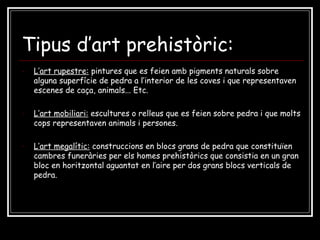 Tipus d’art prehistòric:L’art rupestre: pintures que es feien amb pigments naturals sobre alguna superfície de pedra a l’interior de les coves i que representaven escenes de caça, animals... Etc. L’art mobiliari: escultures o relleus que es feien sobre pedra i que molts cops representaven animals i persones. L’art megalític: construccions en blocs grans de pedra que constituïen cambres funeràries per els homes prehistòrics que consistia en un gran bloc en horitzontal aguantat en l’aire per dos grans blocs verticals de pedra.