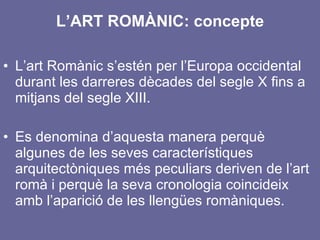 L’ART ROMÀNIC: concepteL’art Romànic s’estén per l’Europa occidental durant les darreres dècades del segle X fins a mitjans del segle XIII. Es denomina d’aquesta manera perquè algunes de les seves característiques arquitectòniques més peculiars deriven de l’art romà i perquè la seva cronologia coincideix amb l’aparició de les llengües romàniques.