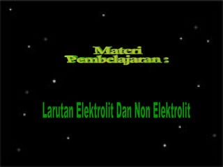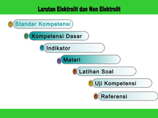 Dokumen ini membahas sifat larutan elektrolit dan non-elektrolit, serta kemampuan menghantarkan arus listrik. Larutan elektrolit dibagi menjadi kuat dan lemah berdasarkan ionisasi, sedangkan larutan non-elektrolit tidak dapat menghantarkan listrik. Contoh dan pengamatan daya hantar listrik dari berbagai larutan juga disajikan.