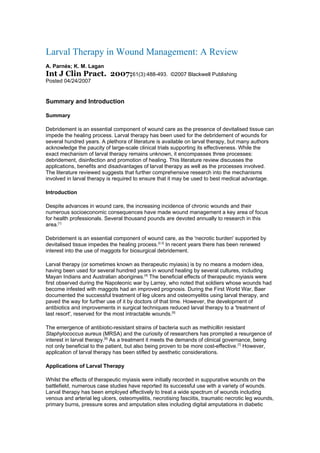 This document provides a review of the literature on larval therapy (also known as maggot therapy or therapeutic myiasis) for wound management. It discusses the applications, benefits, and disadvantages of larval therapy. Some key points:
