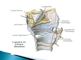 This document discusses laryngeal trauma. The larynx functions to protect the airway and enable phonation. Laryngeal trauma is rare, usually resulting from motor vehicle accidents, strangulation, or penetrating injuries. Injuries can range from minor bruising to fractures or separation of the laryngeal framework. Treatment involves securing the airway, usually through intubation or tracheostomy. Minor injuries are managed conservatively while more severe injuries involving exposed cartilage or vocal fold immobility require surgical exploration and repair. Endolaryngeal stents may be used in very severe cases to support the laryngeal structure during healing.