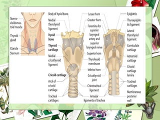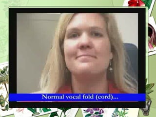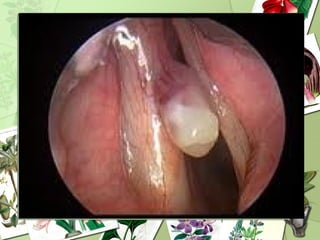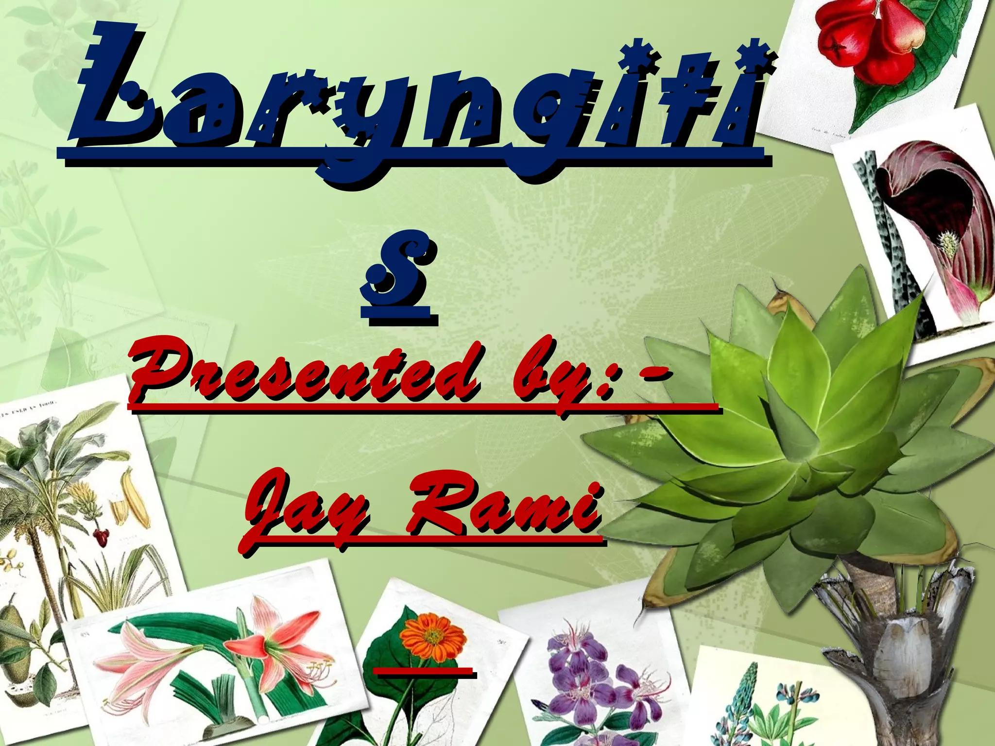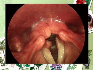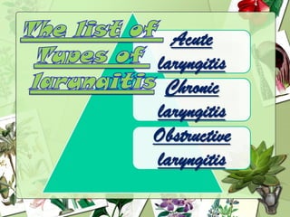 Laryngitis is an inflammation of the larynx or voice box that can be caused by viral or bacterial infection, chemical irritation, or vocal overuse. Common symptoms include hoarseness, coughing, throat pain, and difficulty speaking or swallowing. Acute laryngitis lasts less than 3 weeks and is often caused by viruses. Chronic laryngitis produces lingering hoarseness from long term irritation or misuse. Treatment focuses on voice rest, inhaling steam, cough suppressants, and sometimes short term steroids or antibiotics. Voice therapy can help restore normal voice quality and prevent future issues.