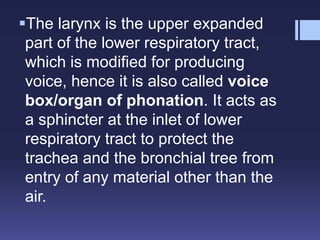 The larynx, or voice box, is located in the neck and contains vocal cords that produce sound. It has three main functions: phonation, respiration, and protection of the lower respiratory tract. The larynx is composed of cartilage, including the thyroid, cricoid, and arytenoid cartilages which connect through joints allowing movements like abduction and adduction of the vocal cords. Intrinsic muscles like the posterior cricoarytenoids abduct the vocal cords while muscles like the thyroarytenoid laterally adduct the vocal cords to modulate vocal pitch and volume. The larynx plays a crucial role in both voice production and airway protection.