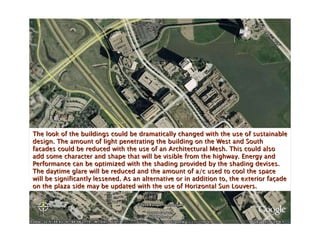 The document discusses potential sustainable design upgrades to the exterior and interior of a building. Shading devices and architectural mesh could be added to the exterior to reduce light and heat penetration while adding visual character. This would optimize energy performance by lessening air conditioning needs and daytime glare. Interior updates are proposed as well, such as a new stairway, updated lobby, and elevator improvements to warm up the spaces.