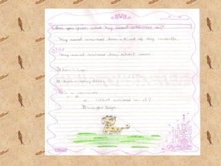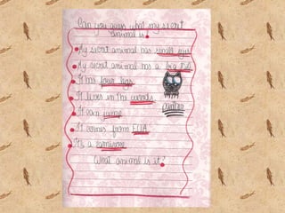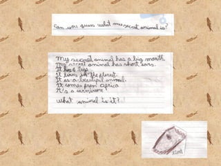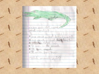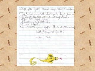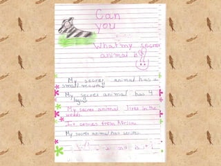 The document describes several secret animals based on clues about their physical characteristics and habitats. The animals include a carnivore from the USA with small eyes and a long tail, a beautiful carnivore from Africa with short ears, an African animal with stripes, a crawler from eggs with a long tail and four short legs, a crawler from eggs with a long tail that lives in the woods and has beautiful eyes, and a mammal from a farm with a very small nose, very short tail, and that is a herbivore.