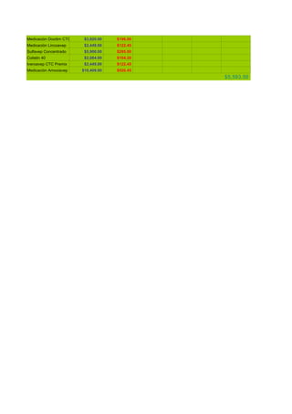 This document contains cost information for different feeding phases of pigs on two different feed formulas containing either 5 liters or 1 liter of Lipozin. It provides the costs per kilogram for each ingredient in the formulas, as well as the total costs for each feeding phase from initiation to gestation. Medication costs are also listed for various drugs.