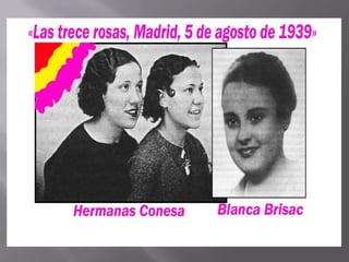 The document discusses 13 young women known as the "Thirteen Roses" who were shot in Madrid, Spain in August of an unspecified year. It provides biographical information about each of the 13 women and describes how they were betrayed, tortured, and unable to say goodbye to loved ones before being shot. It discusses letters written by two of the women, Julia Conesa and Blanca Brisac Vázquez, as well as last words spoken by Ana Lopez Gallego before being shot. Testimonies are also mentioned.