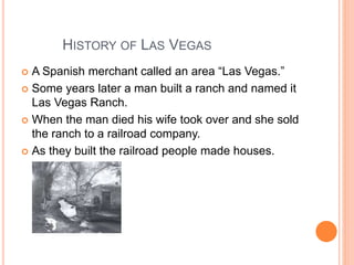 The document provides information about the history, location, climate, population, and environment of Las Vegas, Nevada. It notes that Las Vegas was originally named by a Spanish merchant and later became a ranch. When the ranch owner died, his wife sold it to a railroad company, leading to more development. Las Vegas is located in the northern hemisphere near the Tropic of Cancer, far from the prime meridian. It has a desert climate with hot, dry summers and mild winters, and faces environmental issues around lack of water.